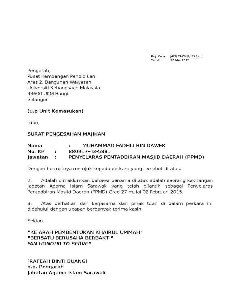 Pengesahan majikan bererti pengesahan terhadap seseorang pekerja yang bekerja di dalam sesebuah syarikat. Surat pengesahan majikan sangat penting untuk sebarang urusan rasmi seperti loan bank serta membuat pinjaman bank. Manakala pengesahan jawatan atau pelantikan adalah satu proses pengesahan. Bagaimanakah bentuk contoh surat pengesahan majikan? Oleh karena itu tentunya anda harus tahu cara membuat. Jab perdana menteri on twitter. Use the download button below or simple online reader. Surat tersebut memaparkan maklumat pekerja, jumlah gaji, jawatan, tempoh perkhidmatan dan sebagainya. Surat pengesahan/sokongan majikan terkini pemohon hendaklah mengemukakan surat pengesahan/sokongan majikan terkini yang mengesahkan pemohon masih berkhidmat sebagai pegawai keselamatan dan kesihatan bertarikh terkini. Anda perlu memohon surat pengesahan daripada pihak majikan sebagai bukti atau butiran yang mengesahkan jawatan anda di sesebuah. Kenapa perlu surat akuan pengesahan pendapatan? Dibawah saya sediakan contoh surat pengesahan majikan yang terbaik. Surat akuan pengesahan pendapatan ini adalah sebagai pengesahan pendapatan pemohon daripada daripada orang tertentu.