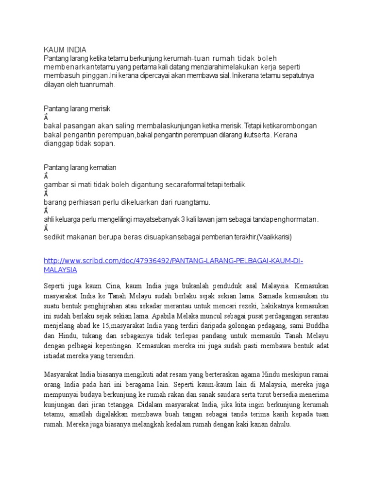 Kaum India from imgv2-2-f.scribdassets.com Rajantheran, jabatan pengajian india, fakulti sastera dan sains sosial, universiti malaya pada hari kedua (26 november 2014) bertempat di padat, shah alam. Antara pantang larang yang selalu dititik beratkan adalah pantang larang perkahwinan dan pantang larang perayaan. Setiap kaum mempunyai pantang larang yang tersendiri. Kepercayaan kaum india kepercayaan / pegangan agama pantang larang 3. Sehingga kematian tidak hanya dialami oleh kaum yang. Itulah dia pantang larang kaum india yang anda mungkin tidak ketahui. Perkara ini boleh diandaikan oleh dukun melalui mimpi, dimana ramalan akan diberi oleh dukun tersebut. Kertas di atas disampaikan oleh profesor dr.